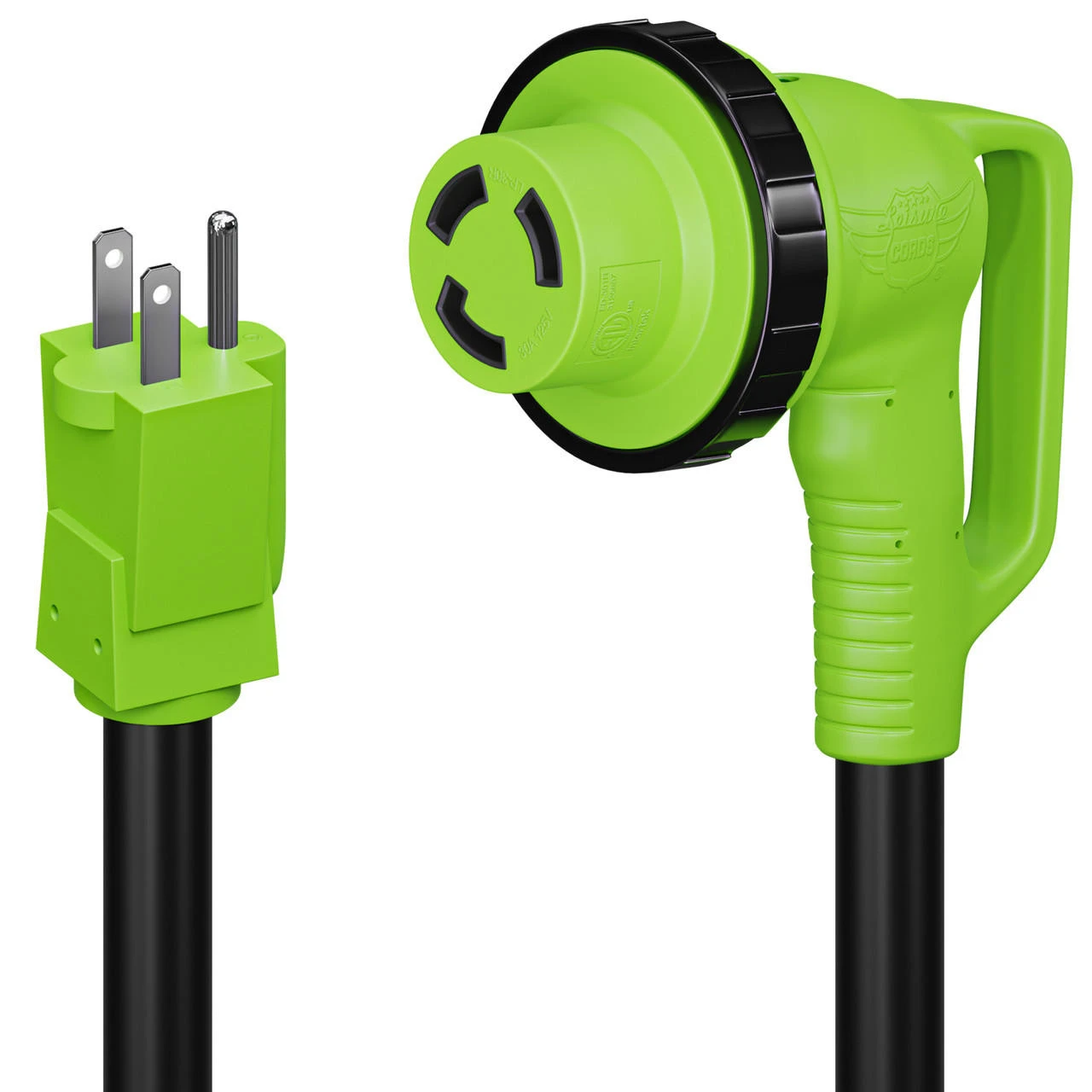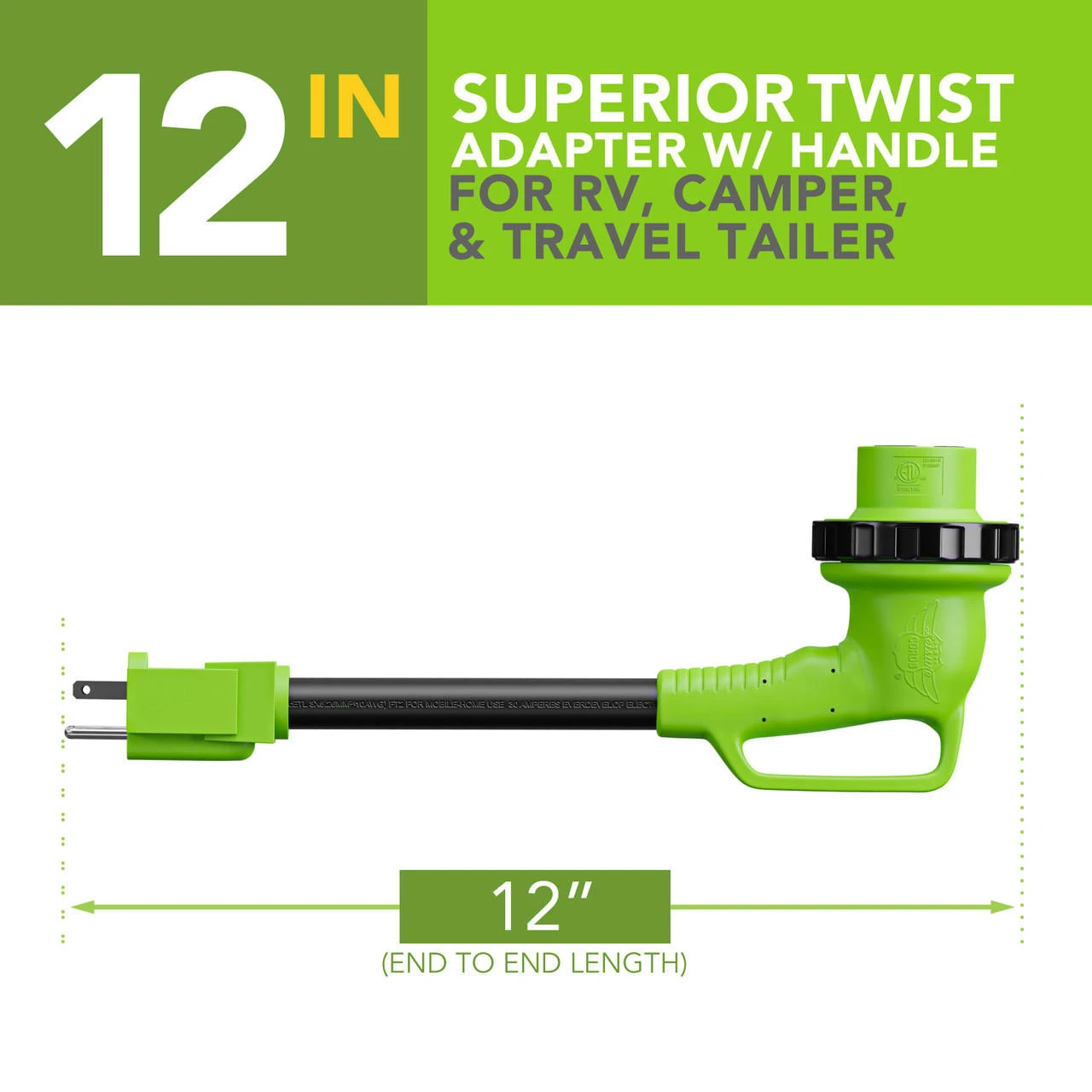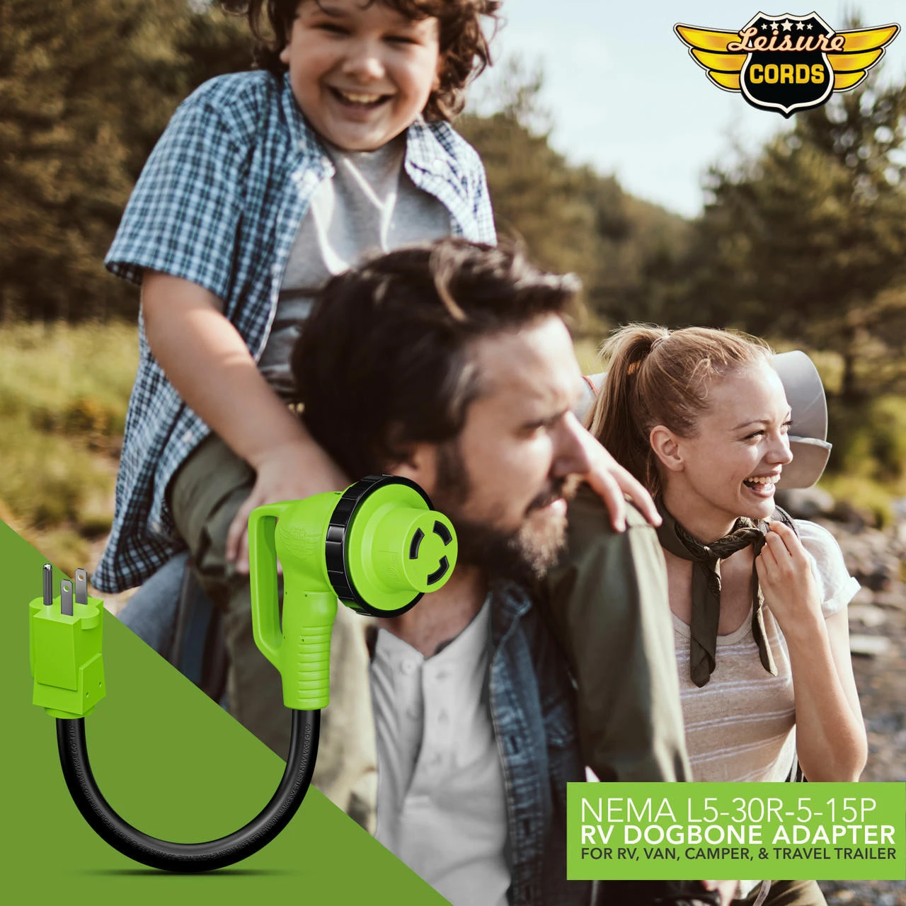 Remember Leisure Cords 12″ 90-Degree Dog-Bone Adapter and forget your worries about power while traveling. Its the perfect tool to keep in your RV for your next trip. Use it to hook up your 30-Ampere to a 15-ampere power source. The 90-degree angle is specifically designed to reduce strain on the cord. Our RV adapter allows for an easier install in hard-to-get places. The female end has a sturdy handle and a LED power indicator light, and it is manufactured with a threaded twist receptor that creates a weatherproof connection that locks and keeps the adapter in place.