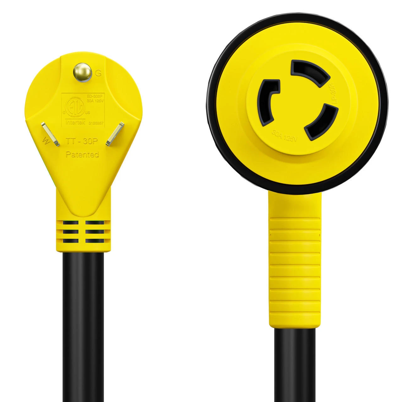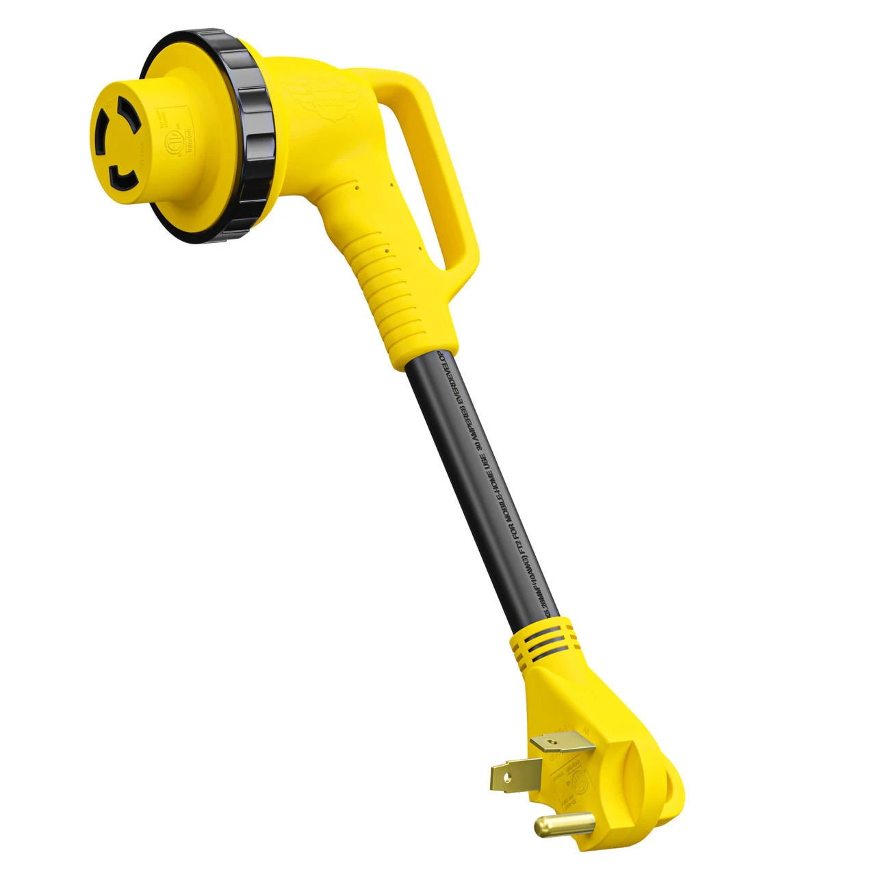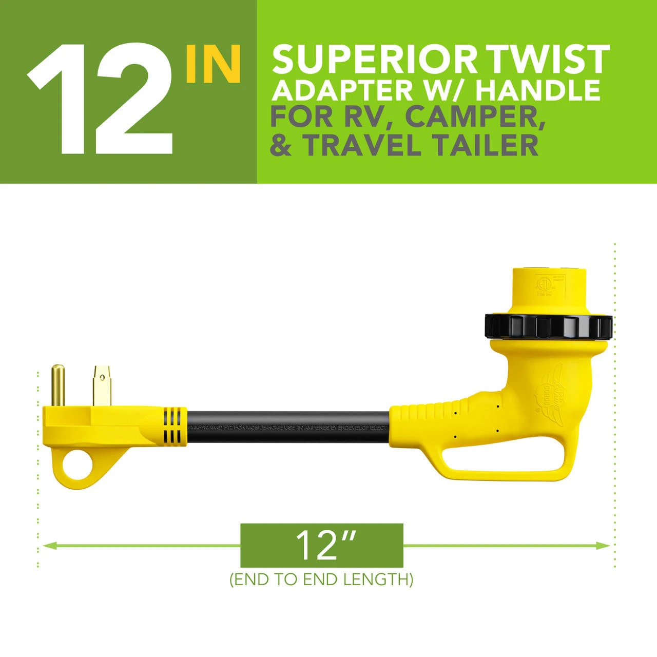 Remember your Leisure Cords 12″ 90-Degree Dog-Bone Adapter, and forget your worries about power while traveling. Its the perfect tool to keep in your RV for your next trip. Use it to hook up your 30-Ampere to a 30-ampere power source. The 90-degree angle is specifically designed to reduce strain on the cord. Our RV adapter allows for an easier install in hard-to-get places. The female end has a sturdy handle and a LED power indicator light, and it is manufactured with a threaded twist receptor that creates a weatherproof connection that locks and keeps the adapter in place.