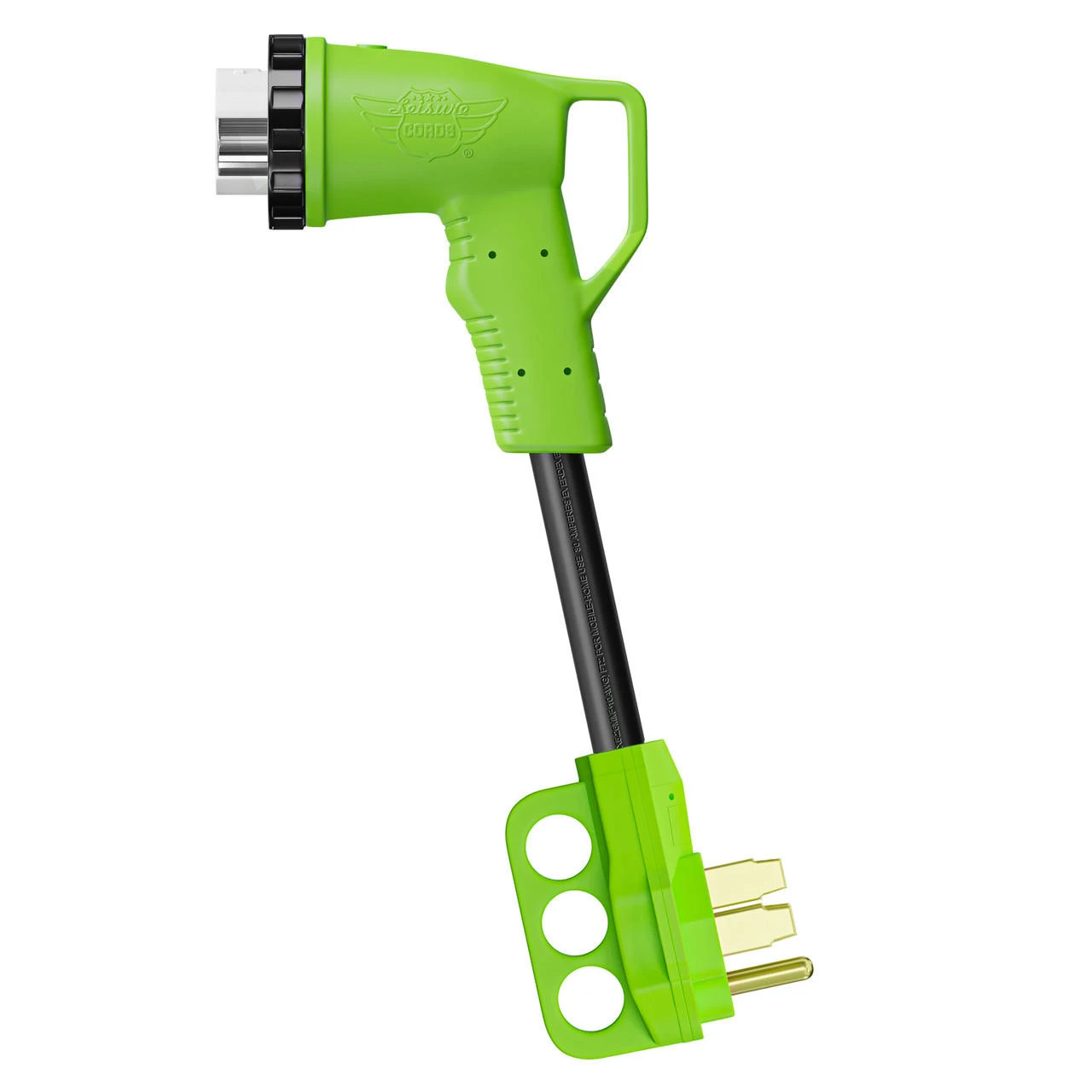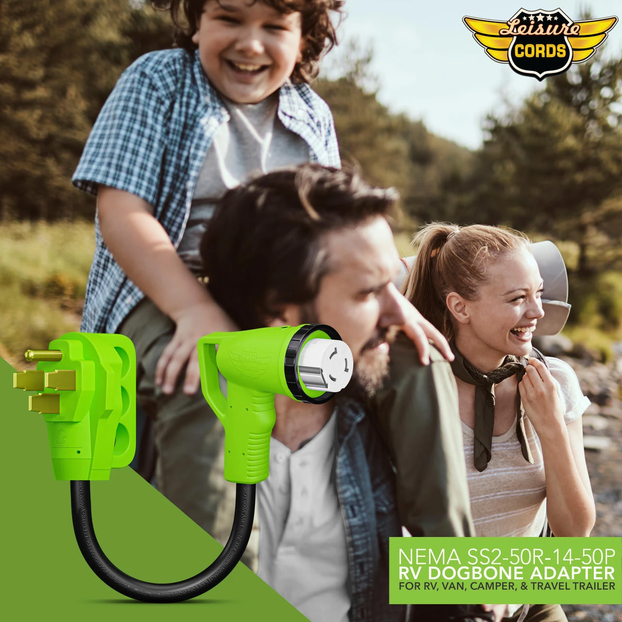 Remember your Leisure Cords 12″ 90-Degree Dog-Bone Adapter, and forget your worries about power while traveling. Its the perfect tool to keep in your RV for your next trip. Use it to hook up your 50-Ampere to a 50-ampere power source. The 90-degree angle is specifically designed to reduce strain on the cord. Our RV adapter allows for an easier install in hard-to-get places. The female end has a sturdy handle and a LED power indicator light, and it is manufactured with a threaded twist receptor that creates a weatherproof connection that locks and keeps the adapter in place.