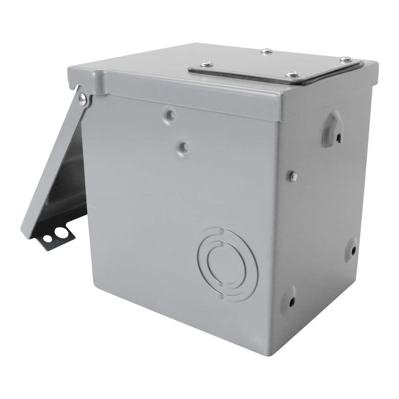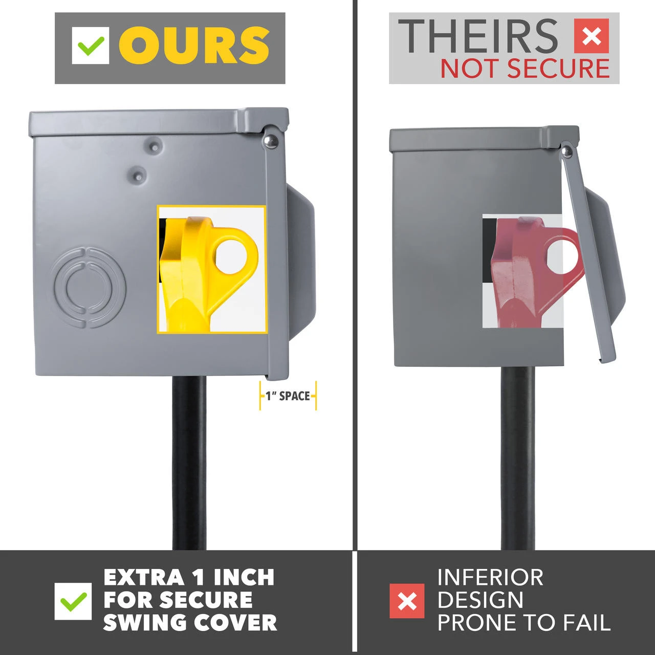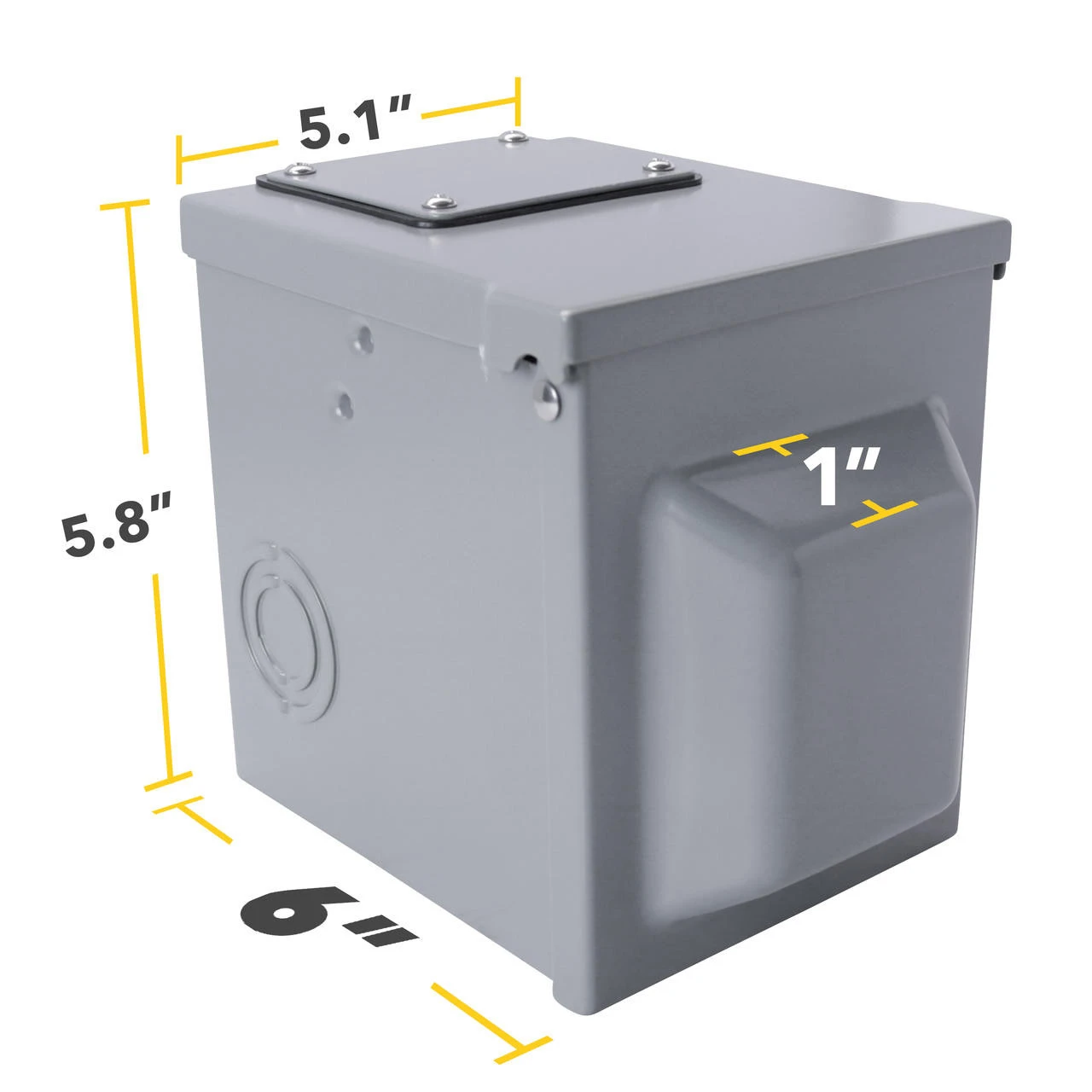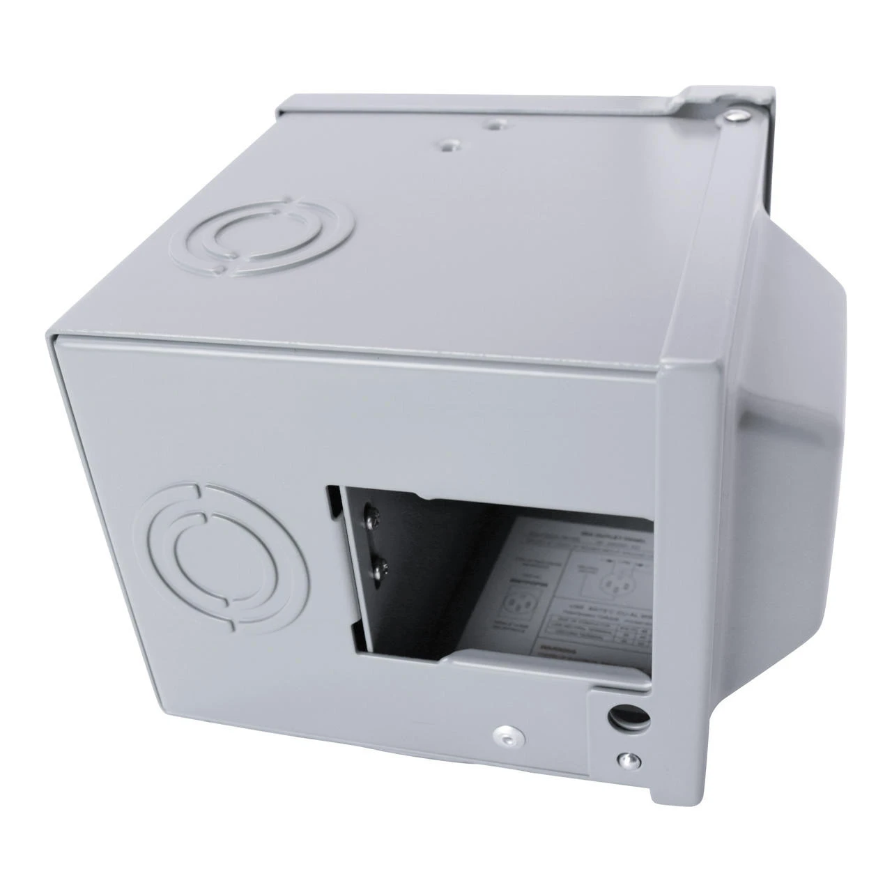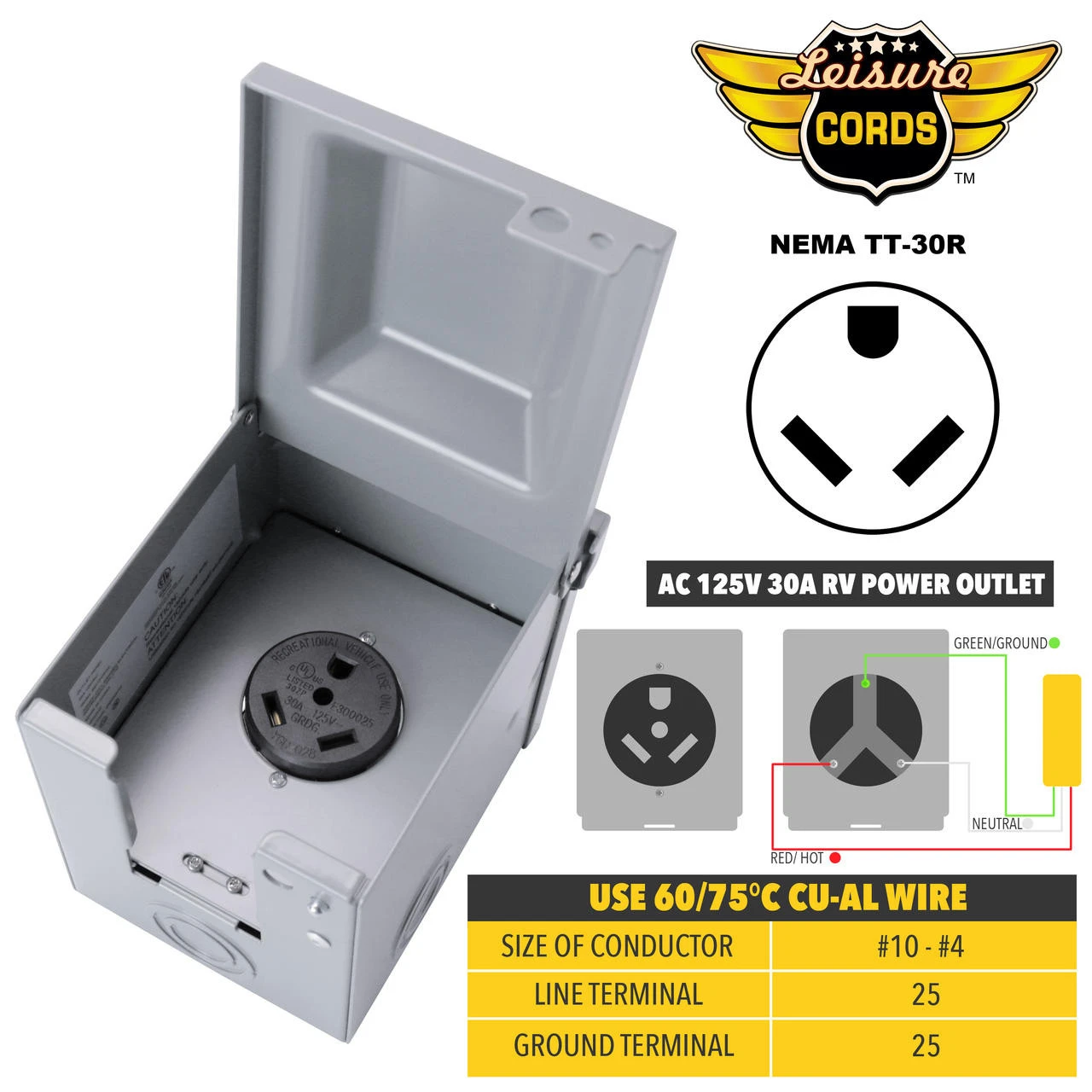 Leisure Cords 30 Amp power outlet box with NEMA TT-30 receptacle Volts: 125 Product Dimensions: 6.1 x 5.7 x 4.8 inches Type 3R enclosure ETL Listed and outdoor rated. There are 3 solid construction knock-out access areas on the bottom sides of the RV receptacle box, which are customiazble options for you to connect conduit. You can choose to knock out these access points or just go through the wire on the top. We recommend using a knock out kit if you choose to knock out one of these access points. (not included) There is enough space to close and lock the door when connected to a large handle 30 amp RV plug with heavy duty stiff rated wire. Using a lock will prevent unauthorized use.  (Lock not included)