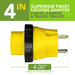 The 30 amp make to 30 amp female standard plug cord includes a handy RV adapter, and the male connecter includes an easy to use molded in pull handle. So, you’ll never have to spend ten minutes just trying to wiggle it loose.