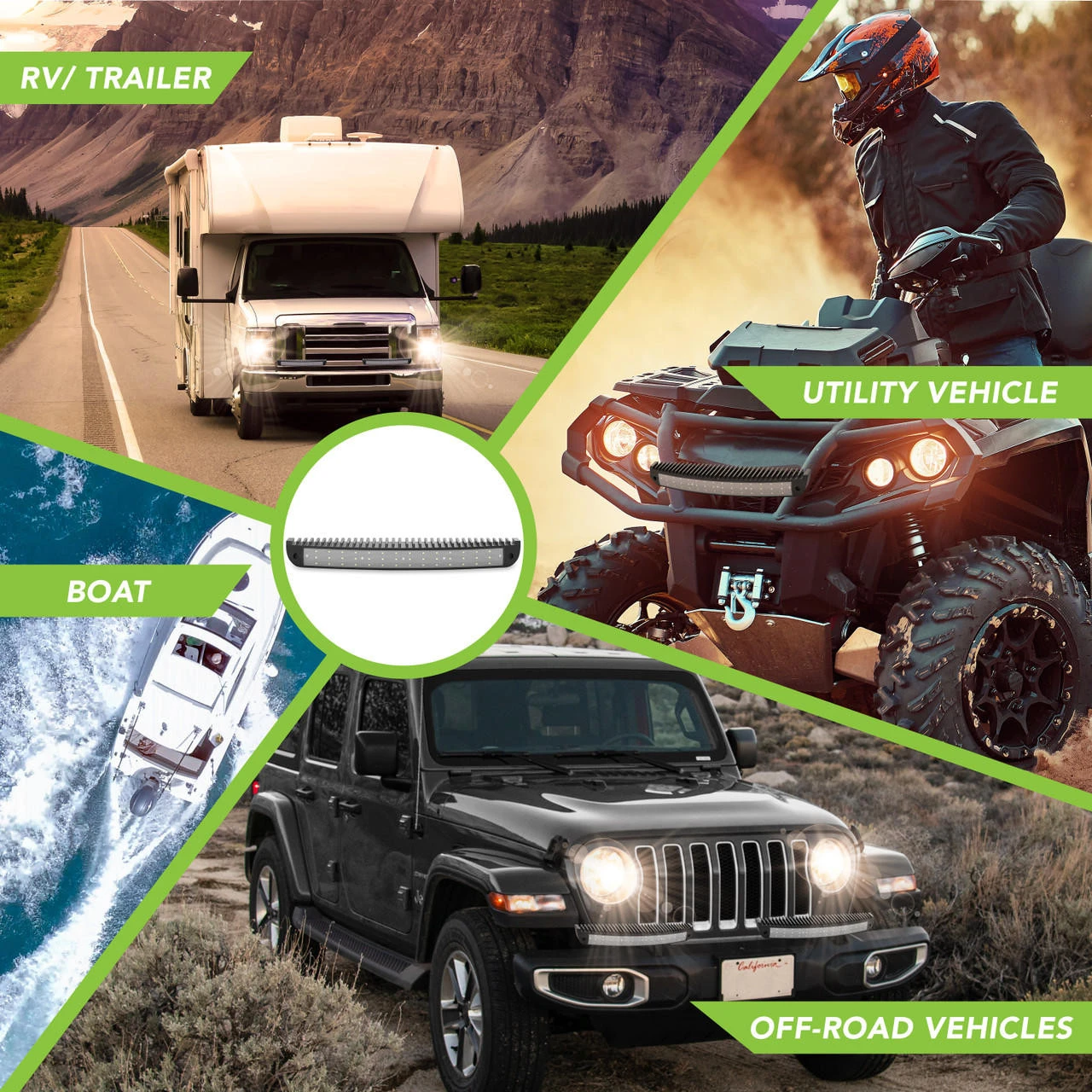 New LED Curved Porch Light Without Switch 3500LUM Cool White Description: LED Rectangle Porch Light Fixture 3500 Lumens Made with Environment-friendly technology and materials. Wide Voltage Range : 12-24 volts Applications include 12 Volts DC recreational vehicles. RV fluctuations can damage a regular LED. This LED is designed to withstand a wide operating voltage range. Beam Pattern : 120 degrees Color Temperature : 6000-6500K Cool White 42 High power LEDs. 42 Power Watts 50,000 hour life expectancy. Last many times longer than standard light bulb