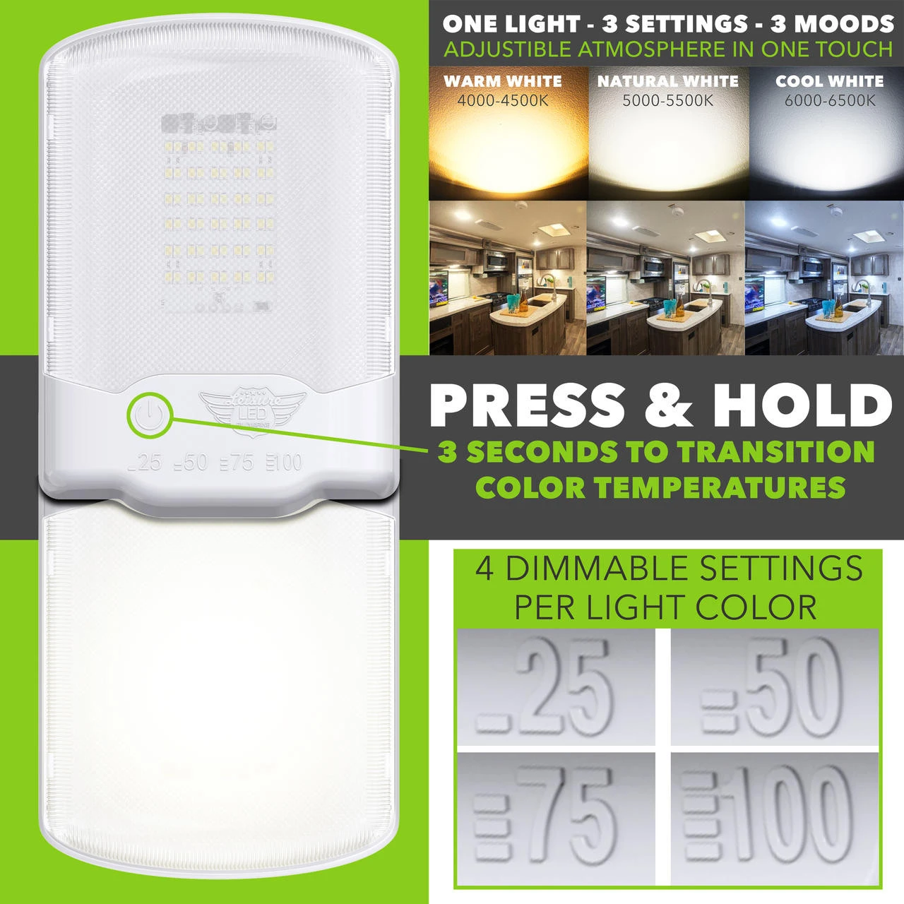 - Innovative Touch Pad Dimmer:Â Touch Pad enables adjustment of light output; 25%, 50%, 75% and 100% illumination. Our Light adds great functionality to any area for lighting and it is widely used as perfect replacement light for Car/RV/Trailer/Camper/Motorhomes/Marine Boats.