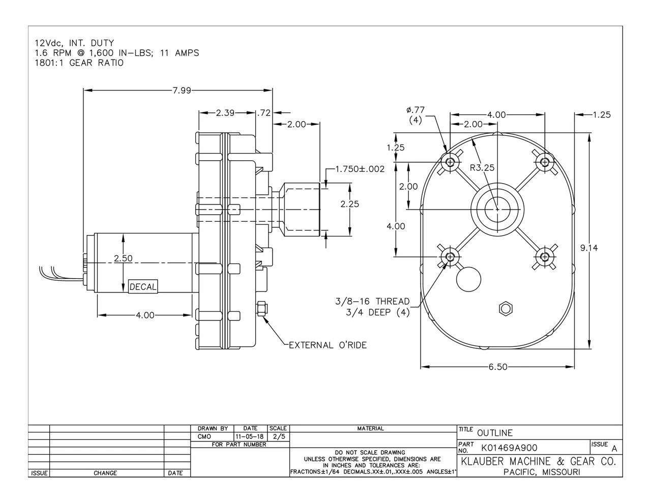 RV Slide Out Motor Klauber Motor K01469A900 REPLACES K01176-A900 31875 74447