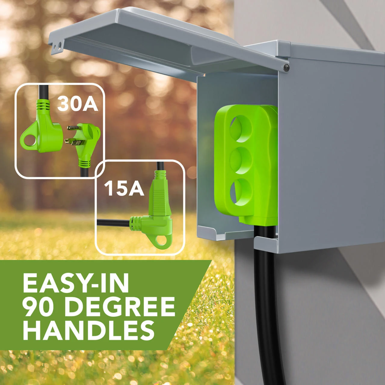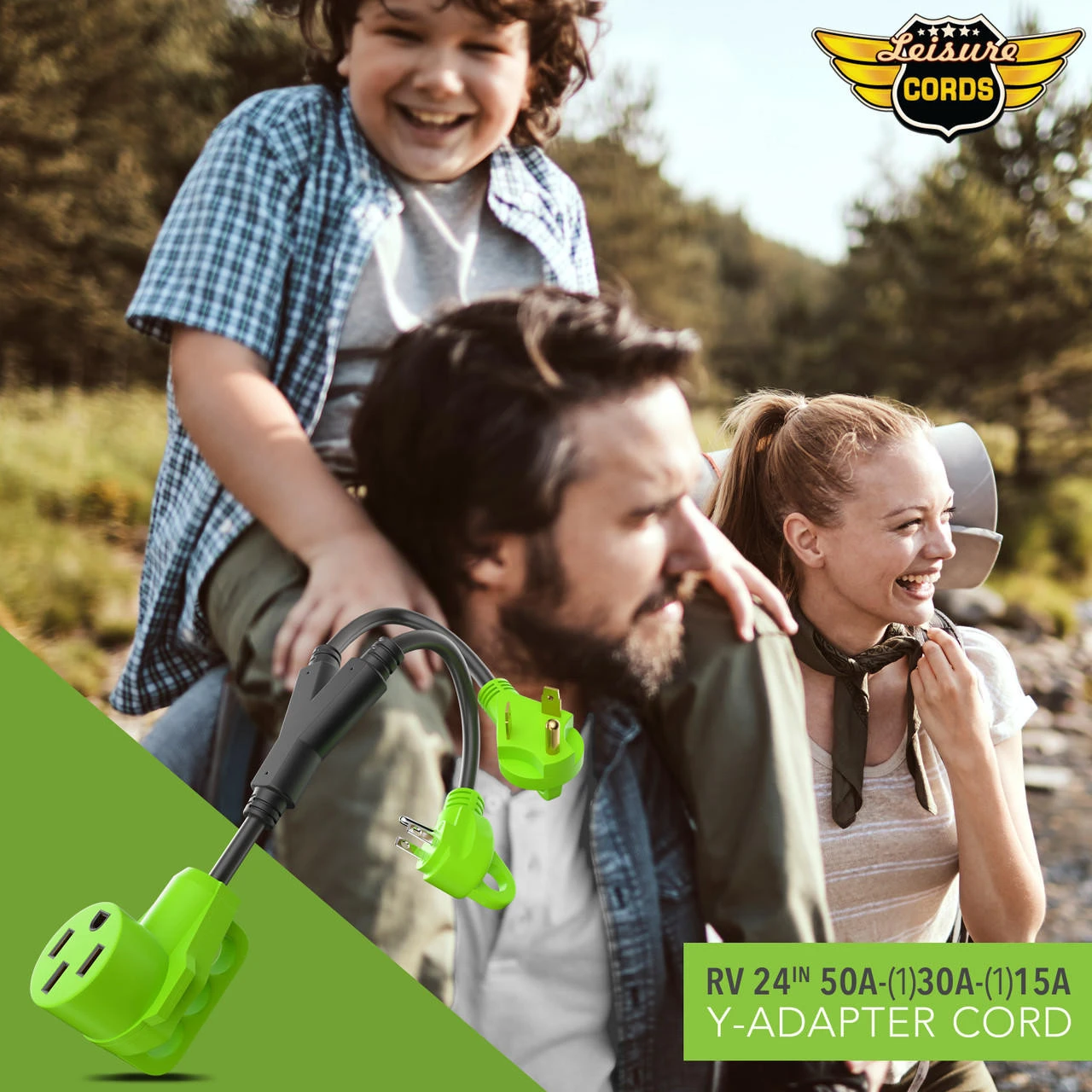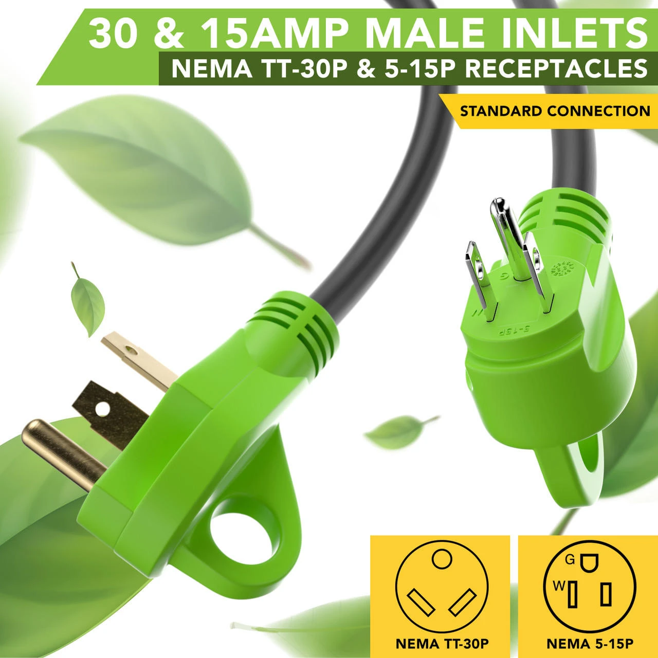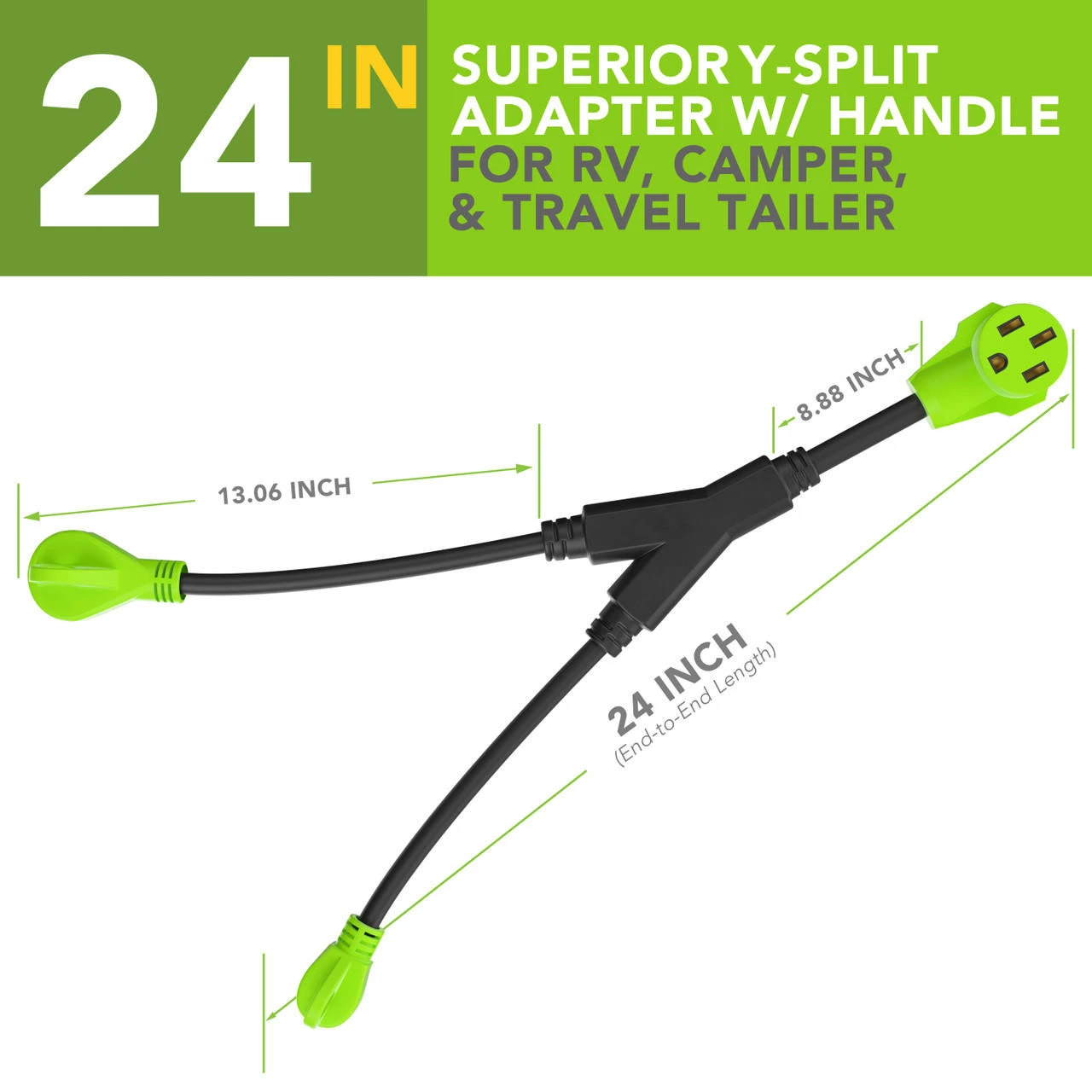 Splits your 50 Amp Female to (1) 30 Amp Male-(1) 15 Amp Male-Specifications100% copper wire conductor inside -Heavy-duty power adapter cord for RV power inlet pedestal. -Recreational Vehicle charge use. -RV 30A male plug *2EA with handle. -Male side using 10AWG*3 copper inner wire, support max 30 Amp overload. -RV 50A female connector with handle. -Female side using 8AWG*3 copper inner wire, support max 50 Amp overload. -Length : 24 inch plug to plug