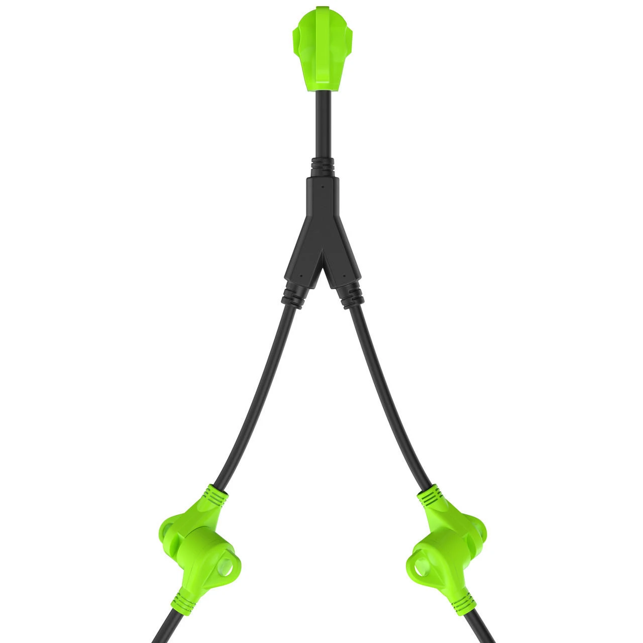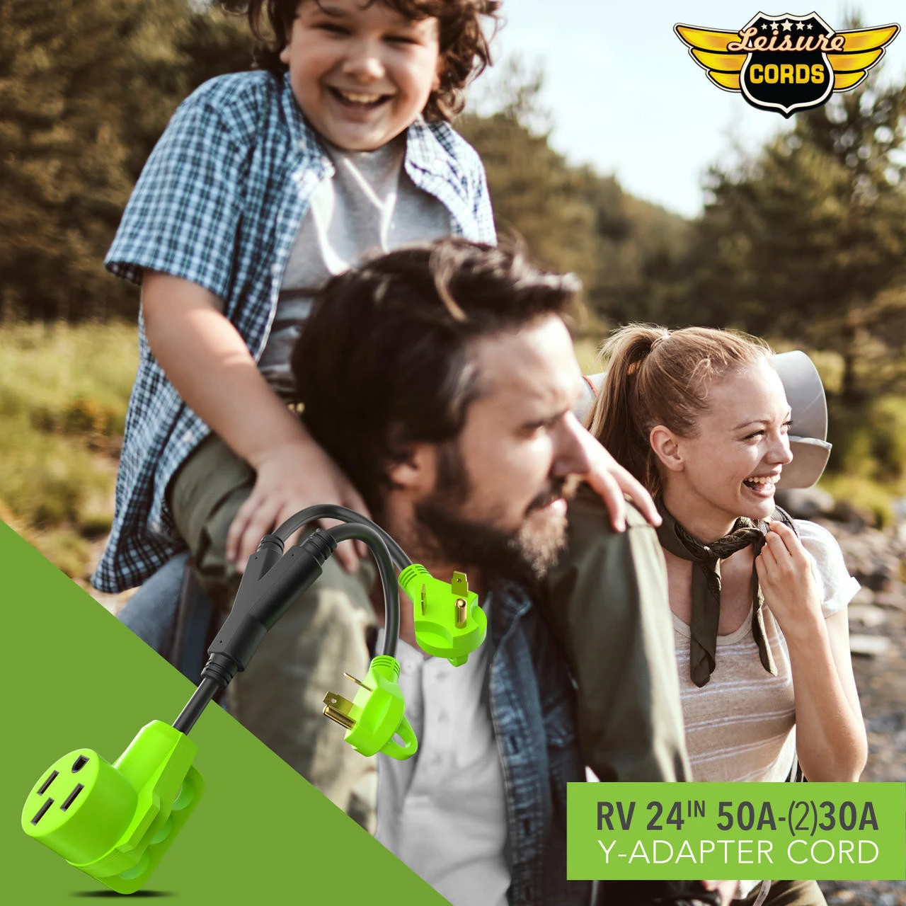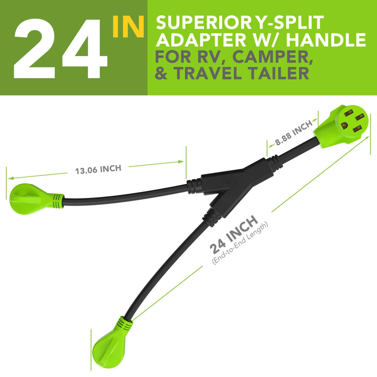 Splits your 50 Amp Female to Two 30 Amp Male -Specifications100% copper wire conductor inside -Heavy-duty power adapter cord for RV power inlet pedestal. -Recreational Vehicle charge use. -RV 30A male plug *2EA with handle. -Male side using 10AWG*3 copper inner wire, support max 30 Amp overload. -RV 50A female connector with handle. -Female side using 8AWG*3 copper inner wire, support max 50 Amp overload. -Length : 24 inch plug to plug