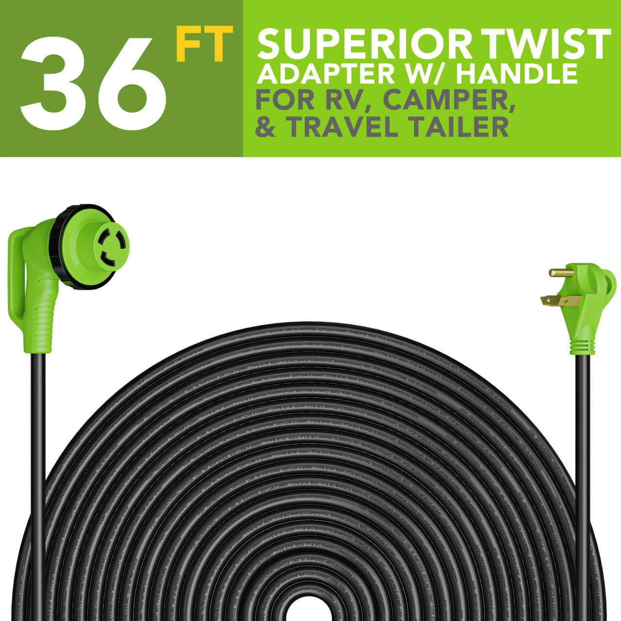 This 36 foot, 30 amp cord with a 90 degree locking plug is perfect for your RV, travel trailer, motorhome or anywhere else you need a reliable, weatherproof power cord.