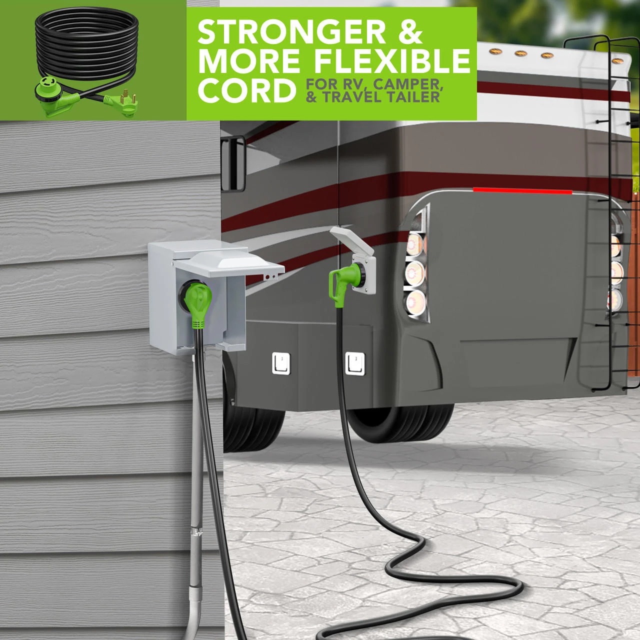 - Connects the campground or park power to your RV, Motorhome, Trailer or vehicle.